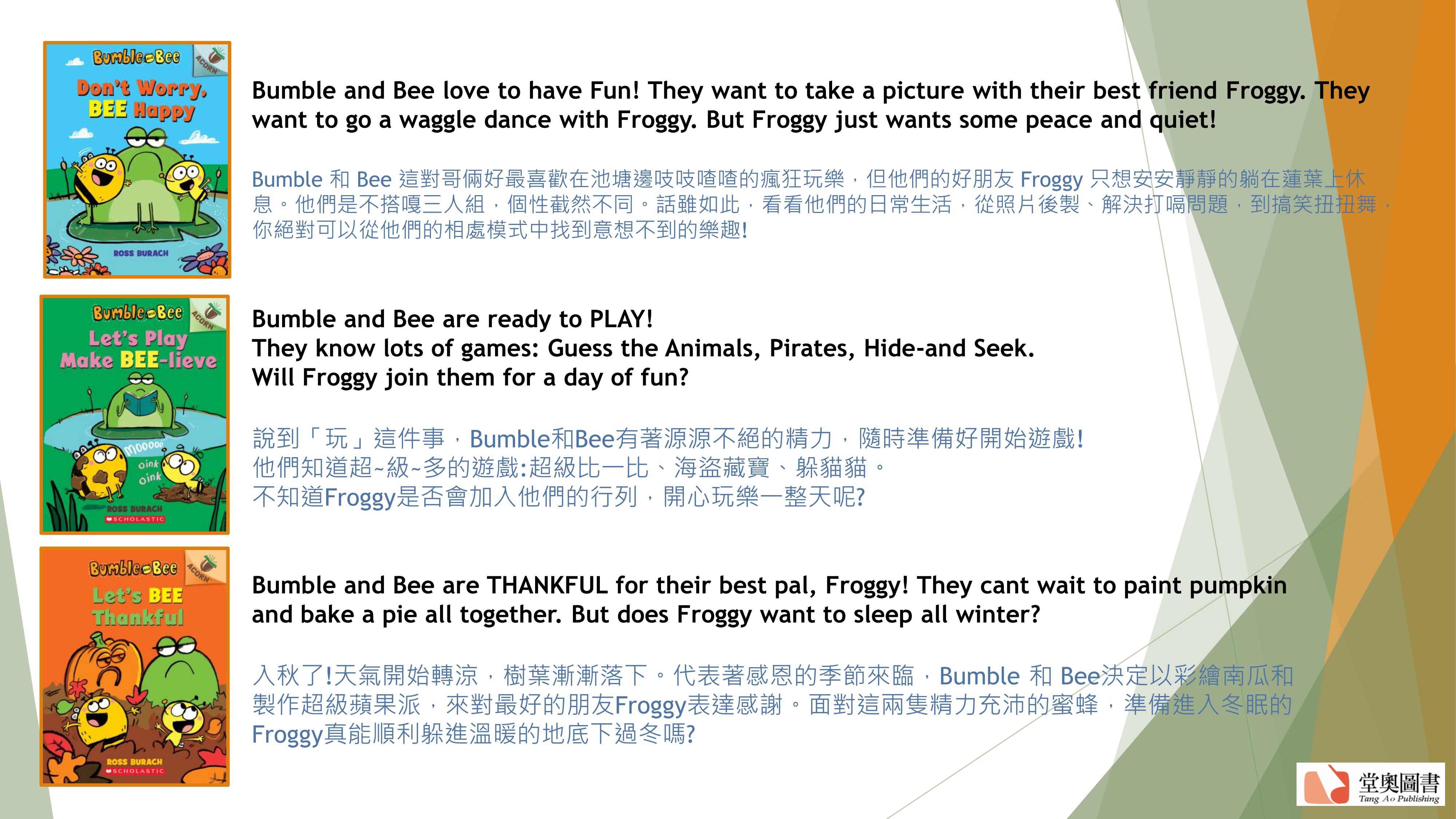 作者:Ross Burach (Author, Illustrator) 出版:Scholastic Asia 頁數:48/每冊 尺寸: 210mm x 295mm(學習單) 140mm x 179mm(讀本) 規格:彩色/平裝 級數:Lexile分級 340~360L 適用程度:幼兒園 (4~5歲)