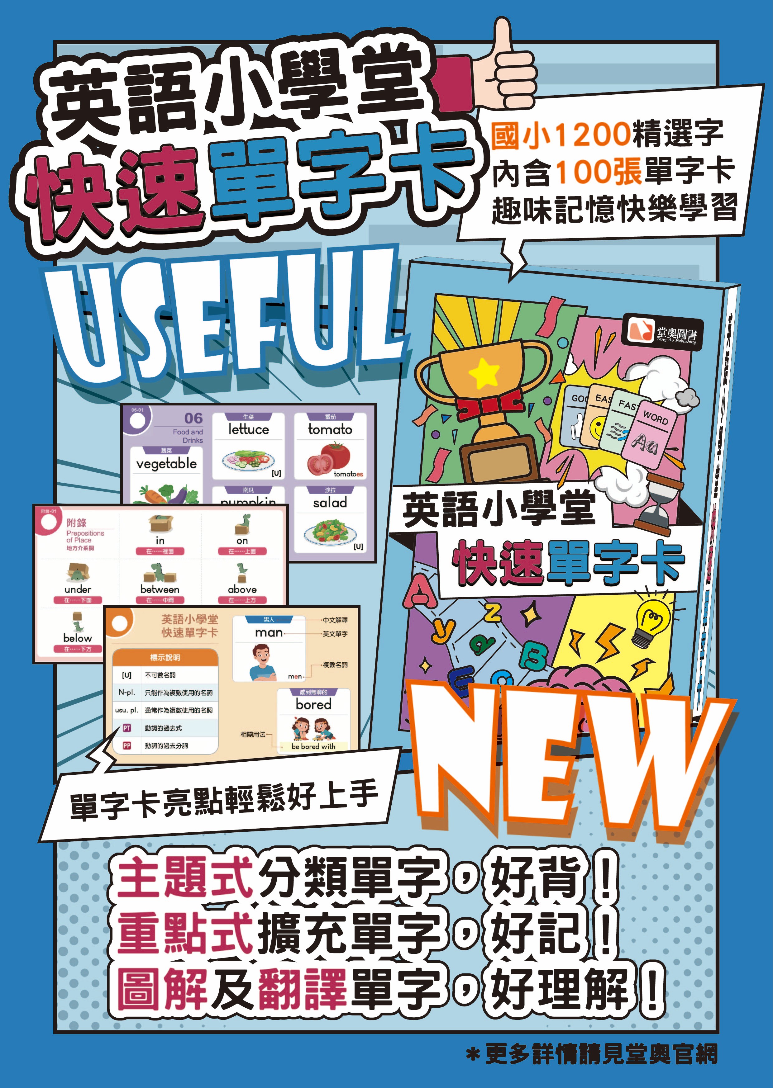 包含動物、食物、顏色、動作、時間、學校用品、身體部位等實用主題,配合學校英文教學進度編排。 -