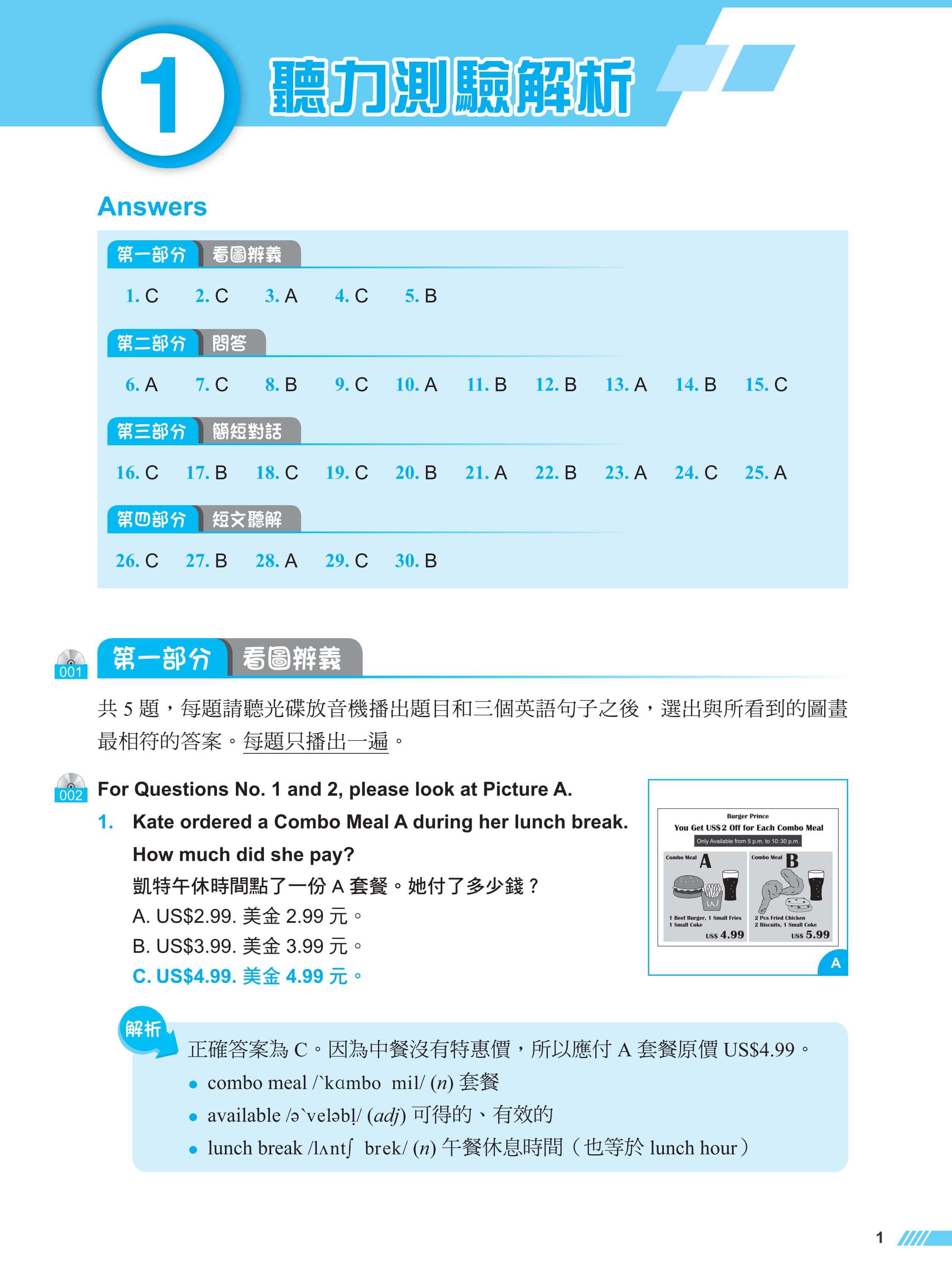 試題、解析分冊之子母書設計,便於學習對照;專業外師錄製試題,速度適中,題目皆為一題一軌;版面清爽易讀,自修與教學都好用。