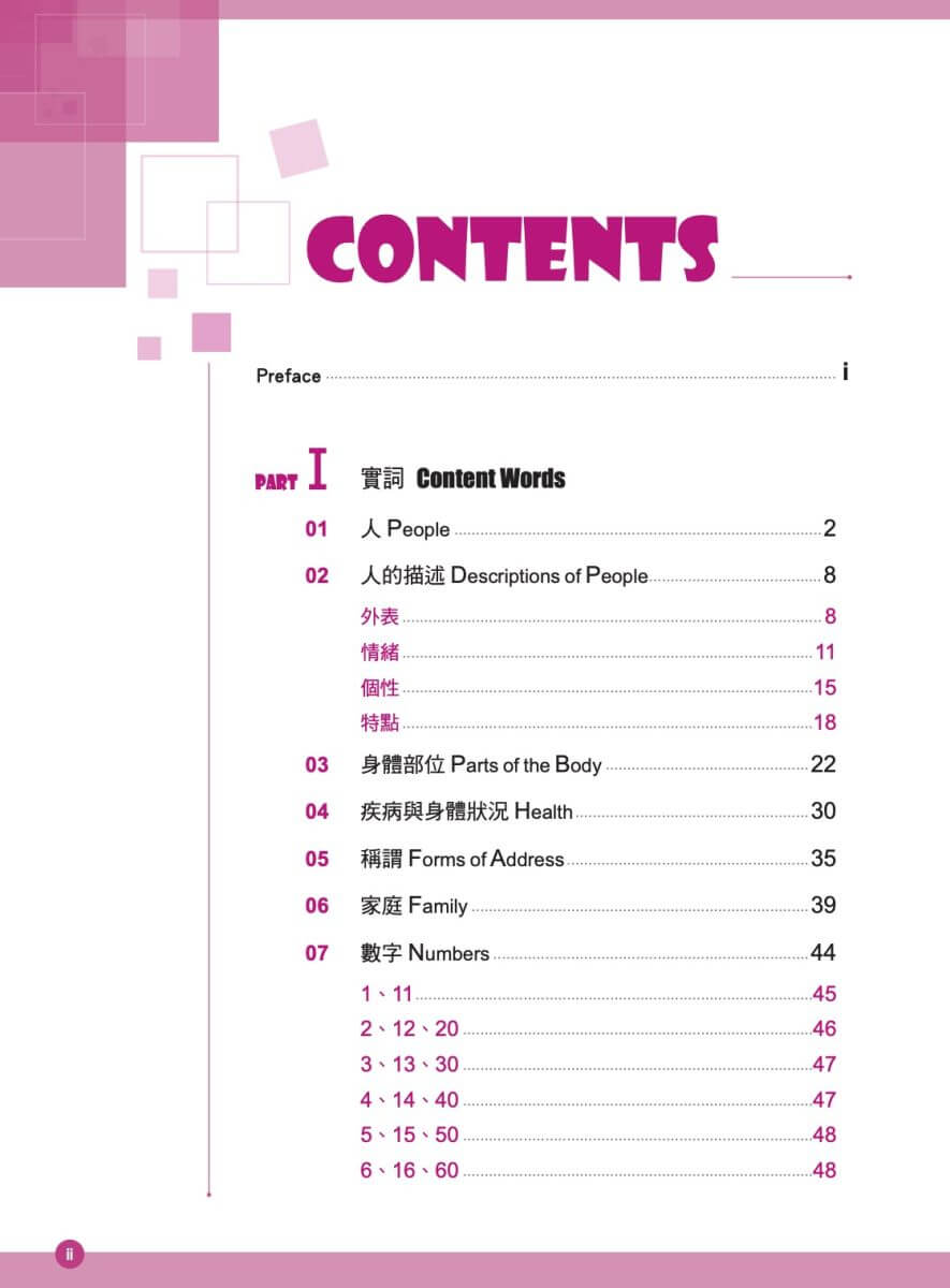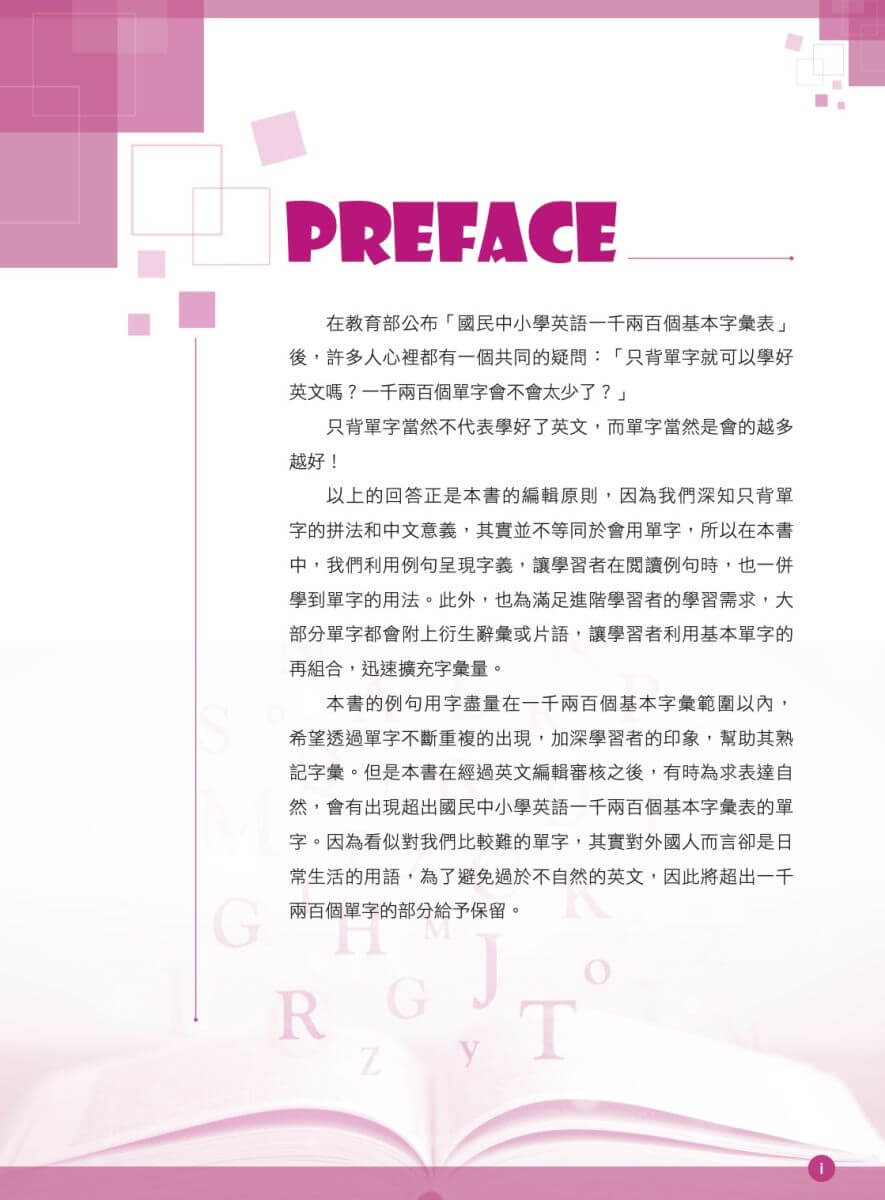 從教育部公布的國民中小學英語一千兩百個基本字彙表出發,將單字有系統的按照主題分類,易於兒童記憶背誦,透過例句了解單字的意義及用法,並有邏輯的擴充相關單字的延伸,提供清楚的外師錄音便於反覆聆聽練習,穿插數則有趣的英文小俚語,為學習增添趣味。